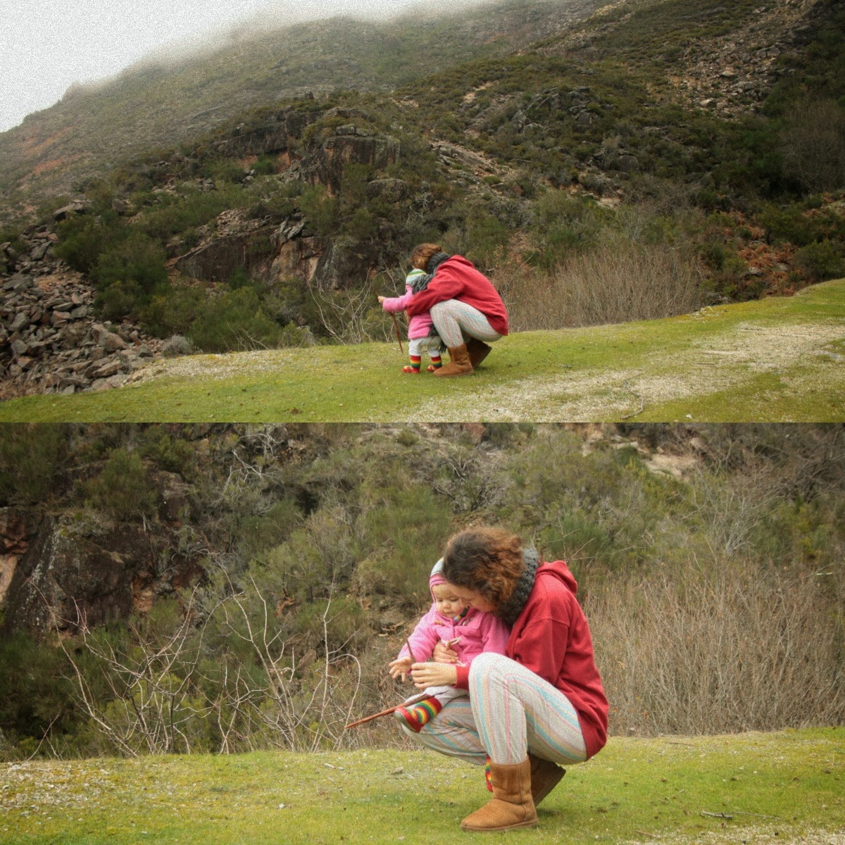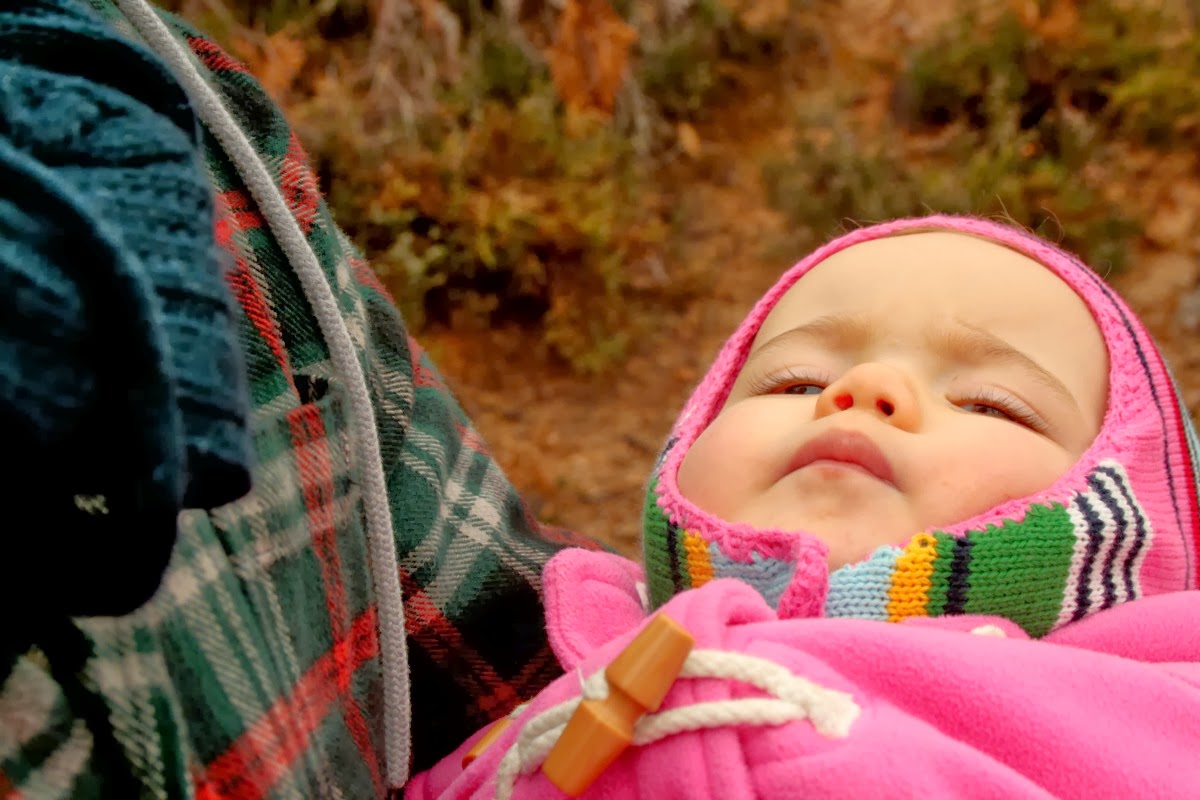 Fez muito frio e nevoeiro, quase não saímos de casa, exceto para um passeio a pé até à mina de água. A Constança foi ao colo, ora de um ora do outro [lamentei outra vez não ter o sling], o que nos cansou bastante, mas valeu a pena. Deu para perceber o quanto ela gostou deste contacto com a natureza pura, bela, apesar de tão fria. Chegou a casa calma e com sono; de facto às vezes o melhor remédio é sair.